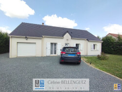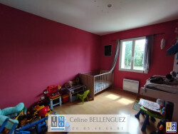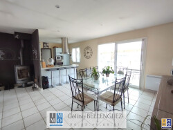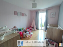 Entrée, séjour de 40 m² avec poêle à bois, cuisine ouverte aménagée et équipée avec cellier attenant, 3 chambres, salle de bains et WC indépendant.