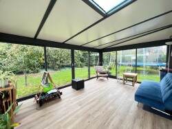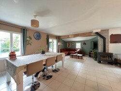 La visite de cette maison débute par une entrée donnant un accès direct sur la pièce de vie disposant d'un poêle à bois. Vous profiterez d'une cuisine ouverte entièrement aménagée et équipée avec retour plan snack. Vous y trouverez également un accès à une lumineuse véranda de 17.50 m².