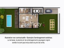 Prestations : chauffage au sol par pompe à chaleur air/eau, volets roulants motorisés, menuiseries alu/PVC, domotique, garage motorisé livré en l'état (non isolé, chape béton).