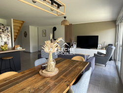 Agréable pavillon récent situé au calme, comprenant une entrée avec rangements, un salon avec poêle à granules, une cuisine ouverte aménagée équipée, une suite parentale avec salle d'eau et dressing, un wc. L'étage comprend une mezzanine, 4 chambres, une salle de bains avec wc. Garage avec coin buanderie. Puits et terrain clos. Vous n'avez plus qu'à poser vos valises!