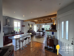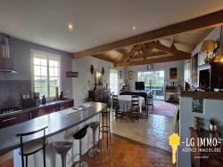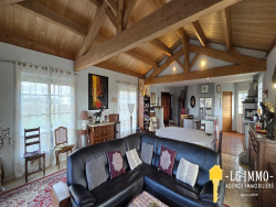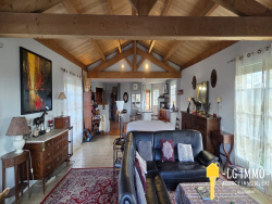 L'agence LG IMMO Cabinet Garéché vous propose un pavillon de plain-pied construit en 2008, d'une superficie totale de 163 m2, offrant confort et praticité. Il se compose d'une vaste pièce de vie de 78 m2 avec une magnifique charpente apparente, comprenant un salon/salle à manger et une cuisine ouverte avec ilôt central, et un cellier de 8 m2 avec chauffe-eau et branchement machine. La partie nuit comprend une salle d'eau de 11 m2 équipée d'une douche à l'italienne et de deux meubles vasque, un WC indépendant et quatre chambres de 10 m2, 11,70 m2 avec dressing, 11,40 m2 et 11,75 m2 avec accès au jardin. La pièce de vie dispose d'une belle luminosité avec ses ouvertures sur 3 façades permettant de profiter des rayons du soleil à tout moment de la journée et s'ouvre sur une terrasse sans aucun vis-à-vis. Plusieurs dépendances, non attenantes, complètent ce bien, notamment un garage de 36 m2, une dépendance d'environ 23 m2 et un box en bois de 33,70 m2. L'ensemble est édifié sur un terrain clos de 1 746 m2 avec portail électrique et accès goudronné jusqu'au bout des bâtiments. Le chauffage est assuré par un plancher chauffant et l'assainissement par une fosse septique. Les menuiseries sont en PVC double vitrage avec volets électriques centralisés + volets bois. La taxe foncière est de 1031 EUR. Pour toute information complémentaire, contactez votre agence LG IMMO au 05 46 97 27 11 ou par mail à cabinet-gareche@lgimmo.net Pour la vente, l'achat, une estimation, consultez nous sur les secteurs de Mortagne-sur-Gironde, Cozes, Semussac, Meschers-sur-Gironde, Saint-Georges-de-Didonne, Grézac, Gémozac, Saint-André-de-Lidon, Thaims...