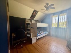 Le rez-de-chaussée se compose d'une entrée, d'une cuisine équipée, d'un salon/salle à manger lumineux, de 2 chambres, d'une salle de bains et d'un WC indépendant. À l'étage, un palier desservant deux chambres supplémentaires, un bureau, ainsi que 2 pièces sous pente.