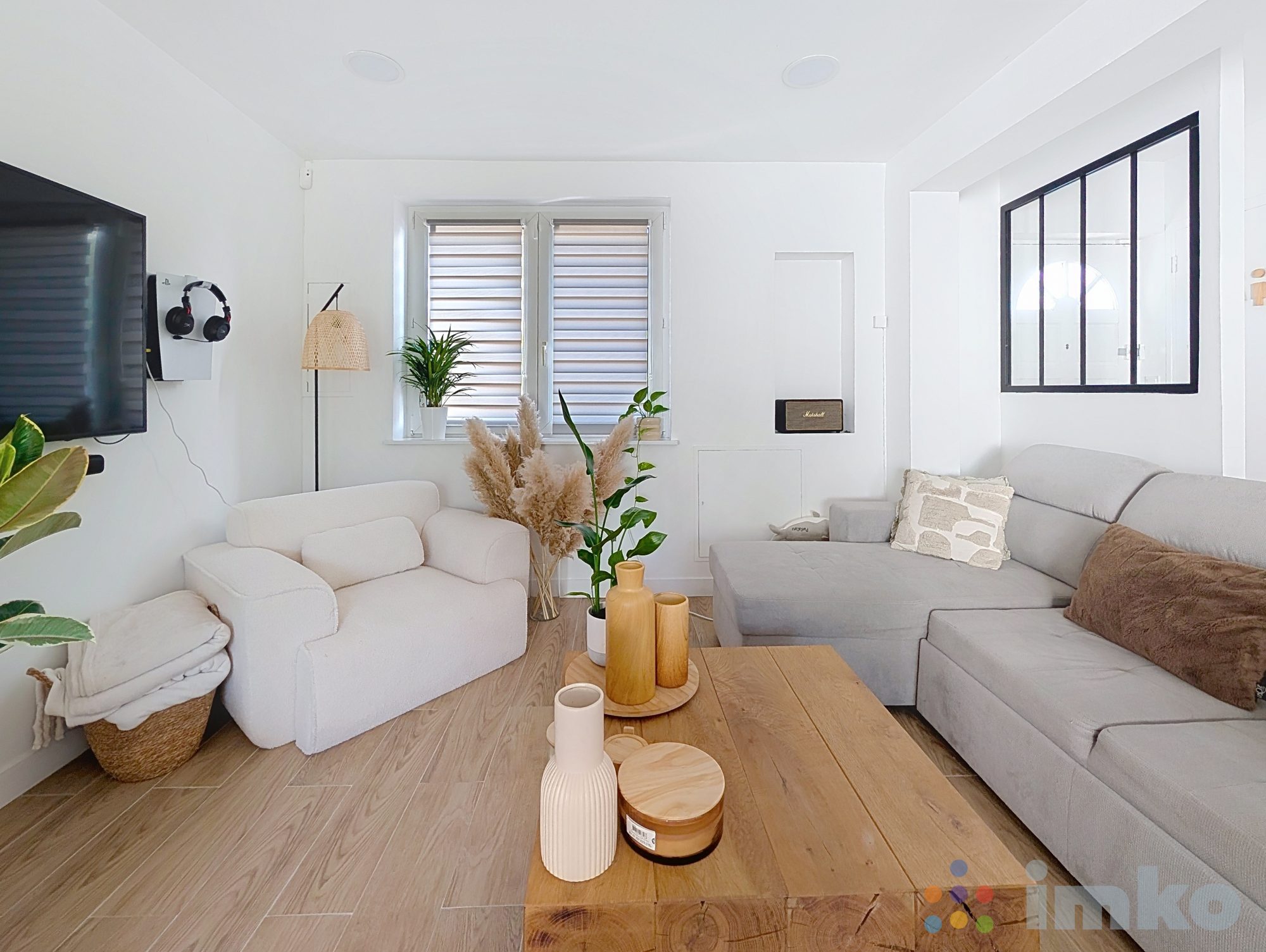 Au rez-de-chaussée: une entrée, grand salon/séjour avec poêle à pellet 12kw (2024) ouvert sur une cuisine aménagée et équipée , un cellier,
