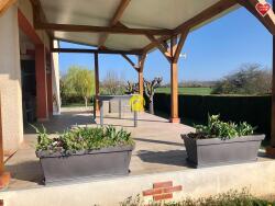 insert bois, cuisine fermée et aménagée avec accès terrasse sous pergola, 2