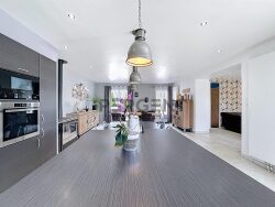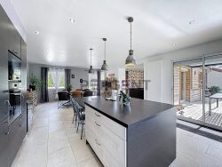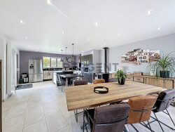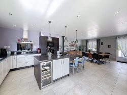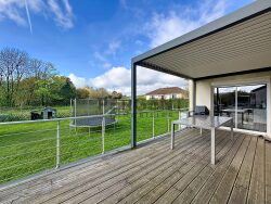 Dès l'entrée, vous serez accueillis par un vaste hall avec dégagement desservant le salon et la grande pièce de vie comprenant une cuisine meublée et équipée ouverte sur la salle à manger. Cet espace convivial donne directement accès à une grande terrasse avec pergola, ainsi qu'à un beau jardin plat à l'arrière de la maison.