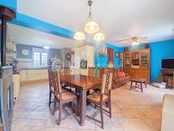 - Au rez-de-chaussée: entrée avec placards, une cuisine aménagée et équipée ouverte sur un salon/salle à manger (48,28m² environ) avec poêle à granulés donnant sur une belle terrasse sans aucuns vis à vis, et un WC.