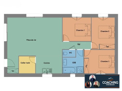 Pavillon offrant une entrée avec placards, un espace de vie de 40m² baigné de lumière ouvert sur une cuisine, 3 chambres, une salle de bains (douche à l'italienne), wc séparé, et une buanderie.
