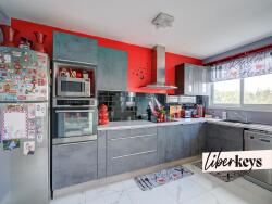 Une grande pièce de vie baignée de lumière, ouverte sur une cuisine moderne, aménagée et équipée.