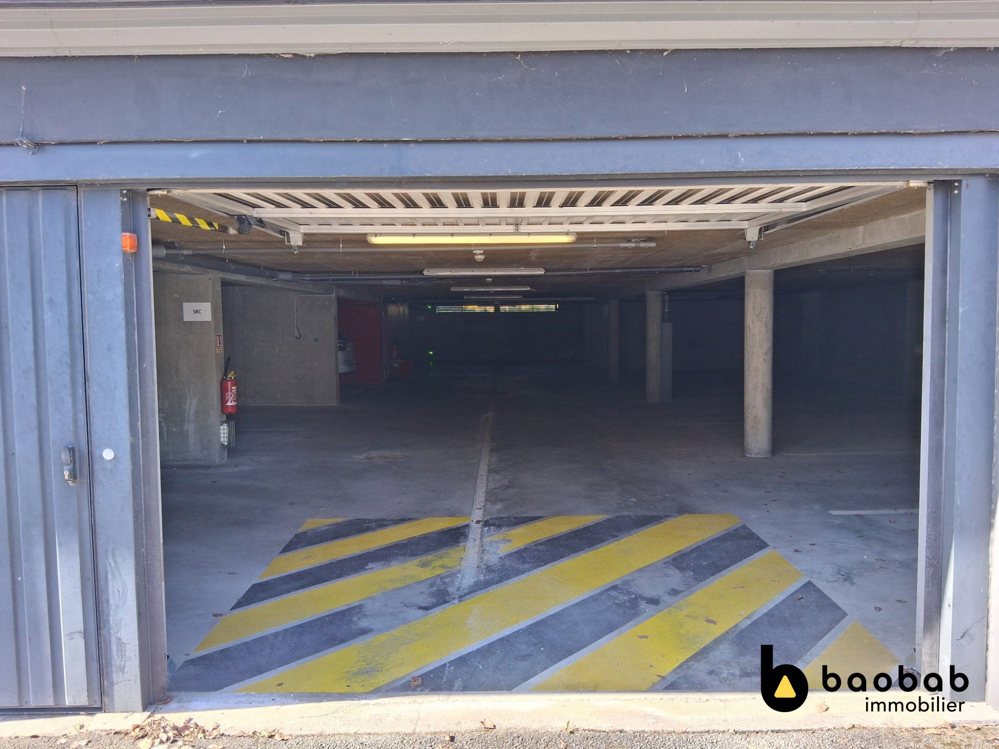 Ce garage en sous-sol bénéficie d'un accès sécurisé par porte motorisée et barrière, avec système d'ouverture par badge.