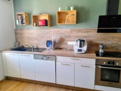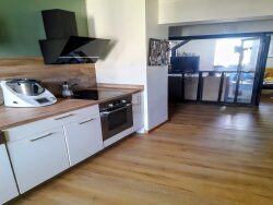 Appartement idéalement agencé: un séjour cosy avec un poêle a granules, une cuisine équipée, 1 chambre avec dressing et bureau, salle de bains, et WC.