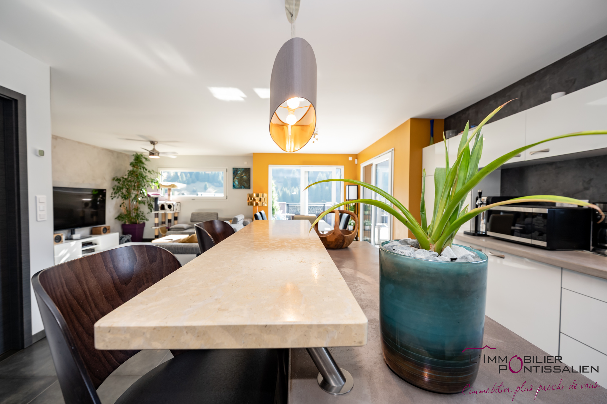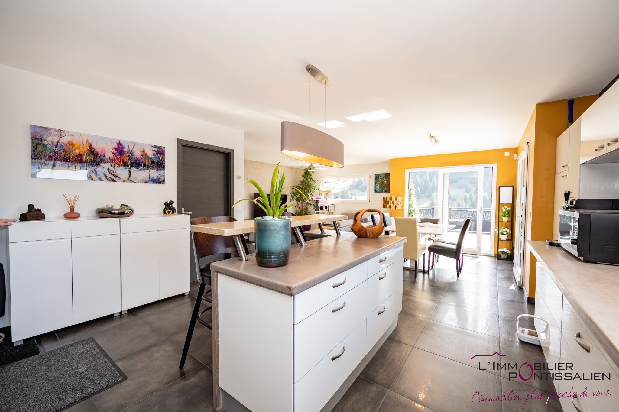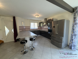 PONTARLIER - QUARTIER DU TOULOMBIEF : Maison individuelle de 2001 comprenant entrée, cuisine aménagée et équipée ouverte sur vaste séjour avec cheminée et accès jardin, 2 chambres, salle d'eau, WC, buanderie, grand garage double, à l'étage : mezzanine, salle de bains, 3 chambres. Sur une parcelle clos et arborée de 516 m2 avec un chalet de jardin. Chauffage au GAZ, DPE en D.