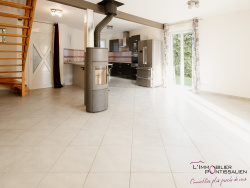 PONTARLIER - QUARTIER DU TOULOMBIEF : Maison individuelle de 2001 comprenant entrée, cuisine aménagée et équipée ouverte sur vaste séjour avec cheminée et accès jardin, 2 chambres, salle d'eau, WC, buanderie, grand garage double, à l'étage : mezzanine, salle de bains, 3 chambres. Sur une parcelle clos et arborée de 516 m2 avec un chalet de jardin. Chauffage au GAZ, DPE en D.