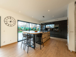 Brenthonne, villa d'architecte contemporaine construite en 2024, offrant des prestations haut de gamme et un confort de vie remarquable. Développant environ 160 m2 habitables sur un terrain plat, arboré et entièrement clôturé de 900 m2, la maison se distingue par ses volumes généreux, sa luminosité et la qualité de ses finitions. Au rez-de-chaussée, une vaste pièce de vie d'environ 80 m2, baignée de lumière grâce à de larges baies vitrées toute hauteur, s'ouvre sur la terrasse et la piscine. La cuisine sur mesure, équipée d'un îlot en quartzite et d'électroménager premium, est complétée par un cellier. Ce niveau comprend également une buanderie, des rangements et offre la possibilité d'aménager une cinquième chambre ou une suite avec salle d'eau. À l'étage, l'espace nuit propose quatre chambres dont une suite parentale avec dressings intégrés et salle de douche, une salle de bain et douche aux matériaux soignés avec WC, et une buanderie.