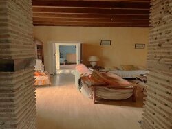 La deuxième partie se présente de la façon suivante, une grande pièce de vie avec cheminée en pierre et foyer fermé, sol en carreaux de gironde, une cuisine équipée ouverte. Une suite parentale avec salle d'eau et WC.