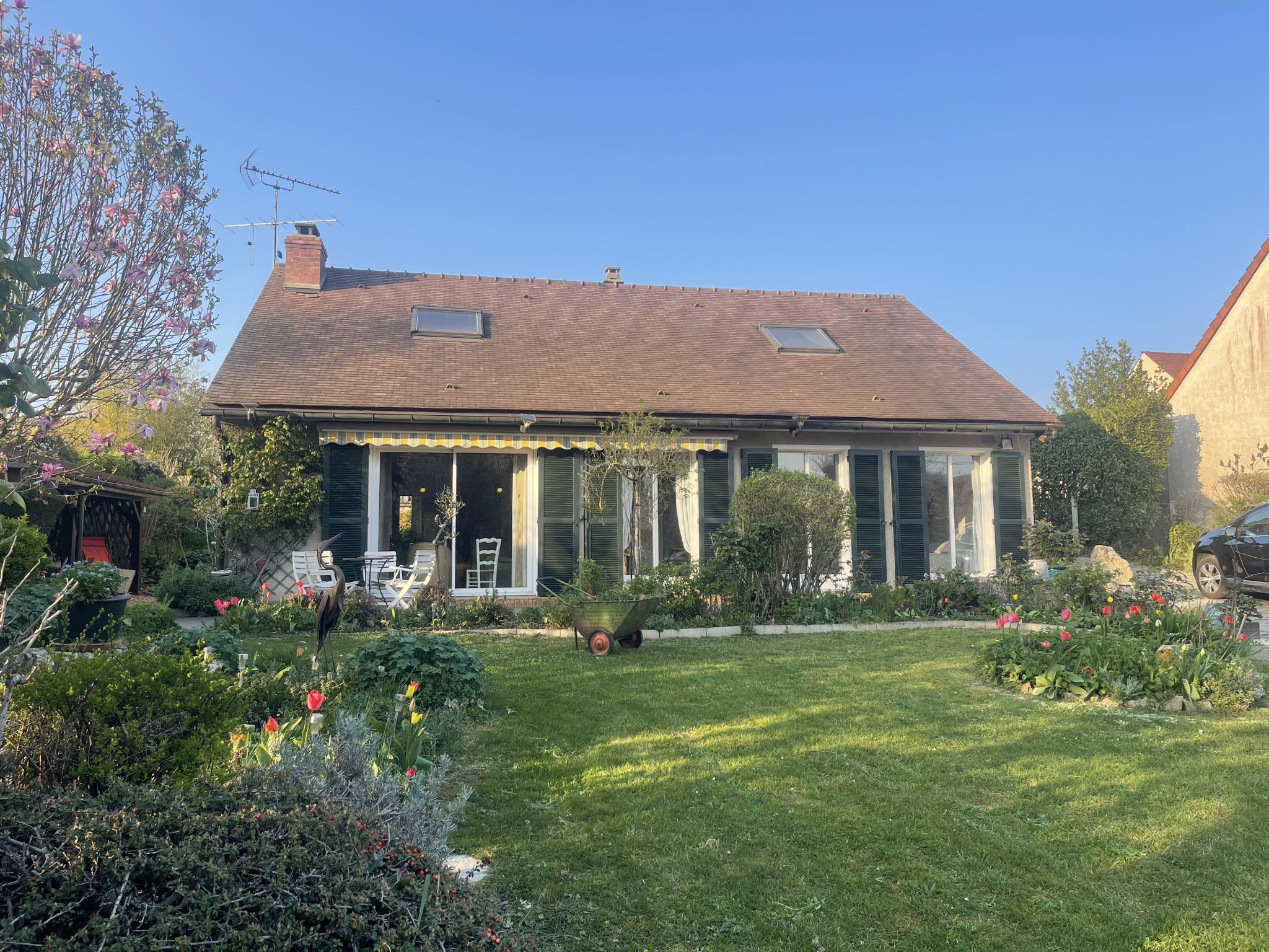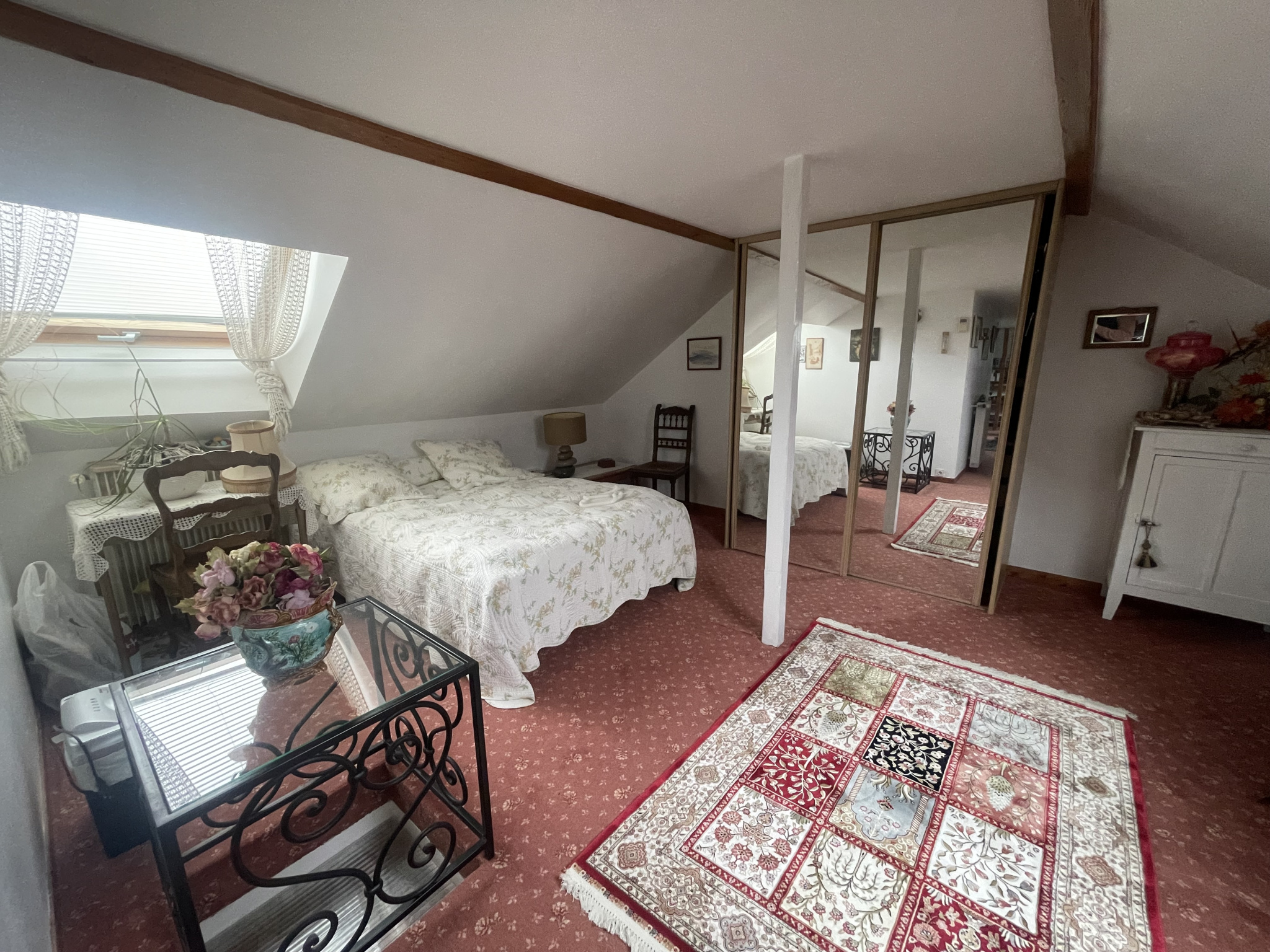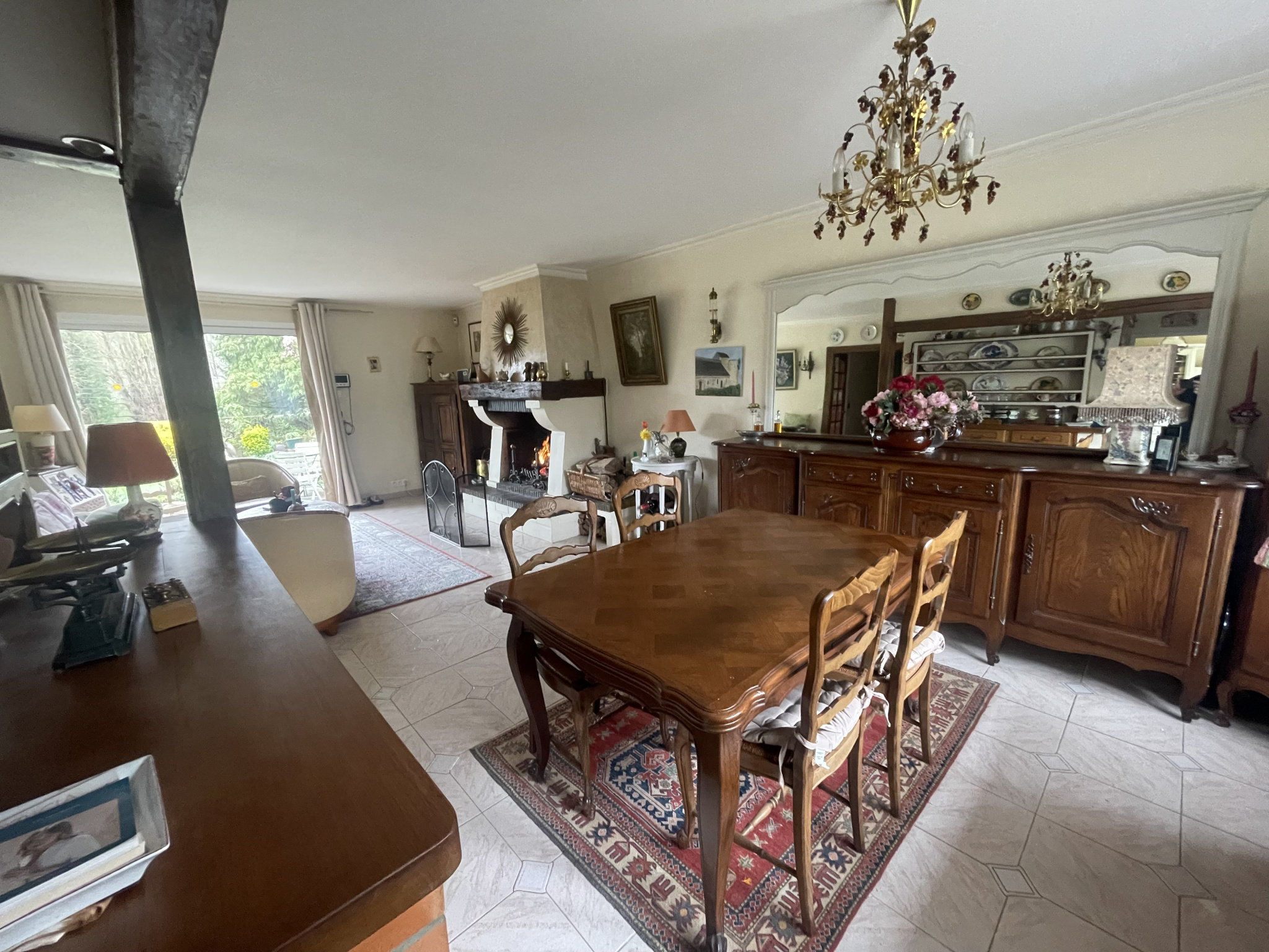 Maison traditionnelle au calme comprenant au rez de chaussé: entrée, séjour double avec cheminée, cuisine équipée, deux chambres dont une suite parentale avec salle de bains, salle d'eau.