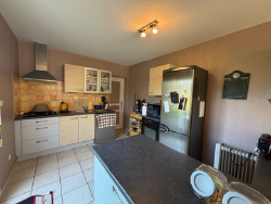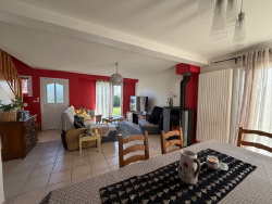 Très belle maison édifiée en 2004 construite en parpaings et couverte en ardoises synthétique, composée : au rez-de-chaussée : entrée sur séjour/salon avec poêle à pellets ouvert sur cuisine aménagée et équipée, wc, une chambre avec douche et meuble vasque, arrière-cuisine/buanderie avec grenier au-dessus ; à l'étage : palier/couloir, deux chambres, salle de bains/wc, débarras ; Carport, châlet. Terrain attenant, l'ensemble sur 4167 m2. Prestations : tout à l'égout, ouvertures double vitrage, beaux volumes.