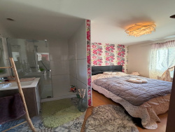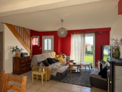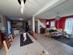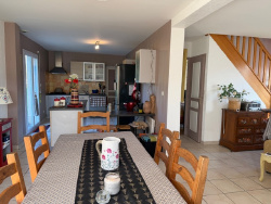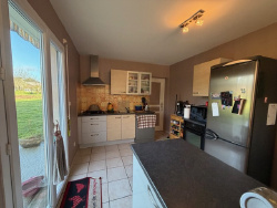 Très belle maison édifiée en 2004 construite en parpaings et couverte en ardoises synthétique, composée : au rez-de-chaussée : entrée sur séjour/salon avec poêle à pellets ouvert sur cuisine aménagée et équipée, wc, une chambre avec douche et meuble vasque, arrière-cuisine/buanderie avec grenier au-dessus ; à l'étage : palier/couloir, deux chambres, salle de bains/wc, débarras ; Carport, châlet. Terrain attenant, l'ensemble sur 4167 m2. Prestations : tout à l'égout, ouvertures double vitrage, beaux volumes.