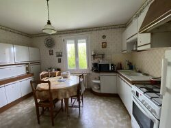 PROCHE ECOLES COMMERCES Idéalement située, maison fonctionnelle de plain pied, comprenant au rez-de-chaussée : hall d'entrée, lumineux séjour/salon sur parquet avec cheminée ouverte, cuisine aménagée, couloir, chambre, dégagement, salle de bains, toilettes. A l'étage : couloir, deux spacieuses chambres avec placards, salle d'eau avec wc. Garage attenant communiquant avec la maison avec grenier au-dessus. Chauffage gaz de ville. chaudière récente(chauffage et production eau chaude), radiateurs en fonte. Huisseries en bois simple vitrage/pvc double vitrage volets battants. Travaux à prévoir. Jardin d'environ 530 m². Raccordement à l'assainissement collectif à prévoir.