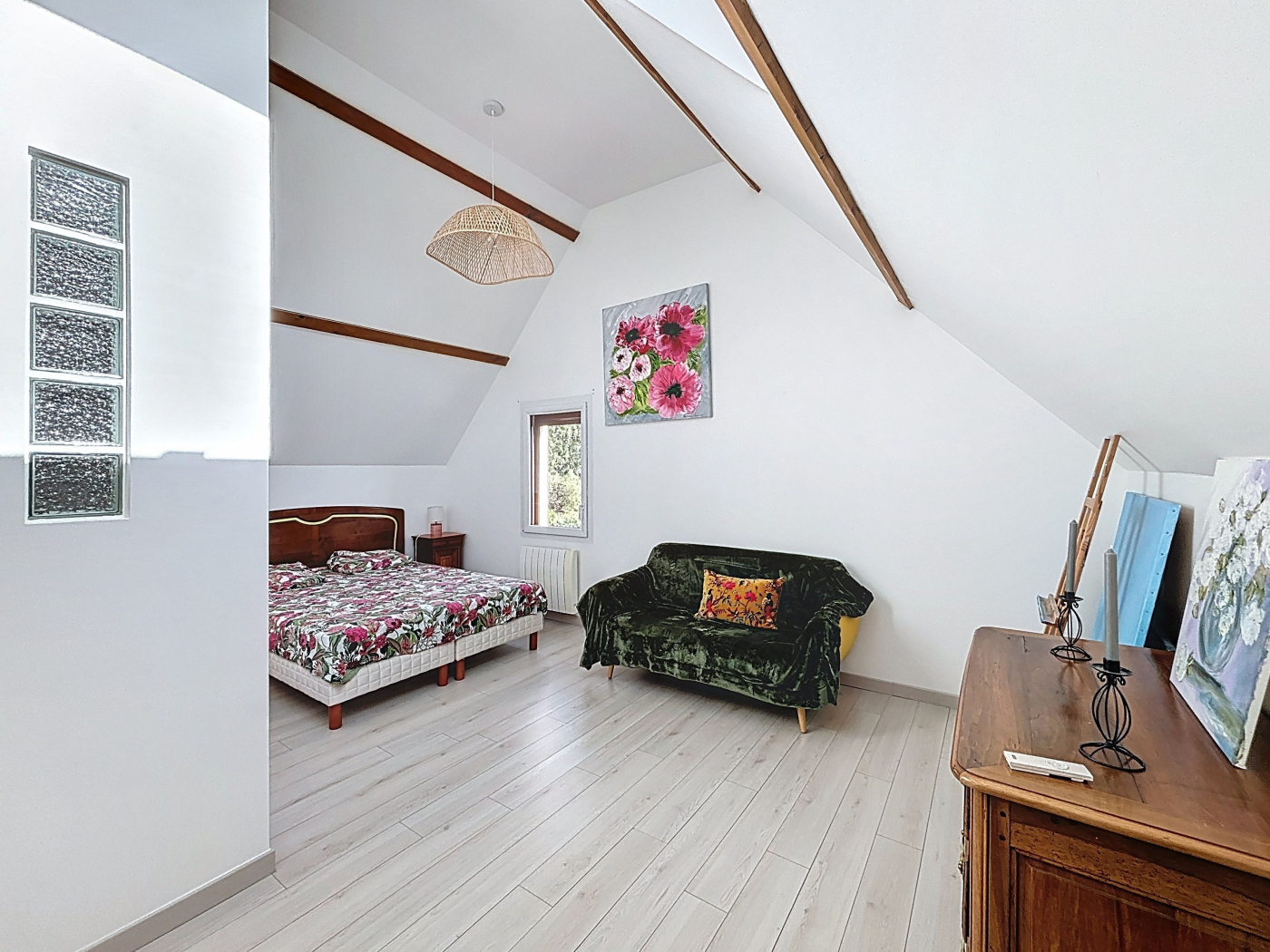 A l'étage: palier, deux grandes chambres, wc avec lave-mains.