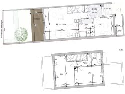 3 chambres expo sud ouest, jardinet terrasse. Au rez de chaussée : Une chambre RDC côté cour. salle d'eau et wc A l'étage : deux chambres dont une très grande, salle d'eau, wc.