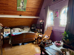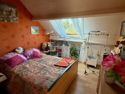 A l'étage sur un plancher béton, palier desservant 3 chambres dont deux spacieuse en enfilade (possibilité de les rendre indépendante) salle de bains avec wc.