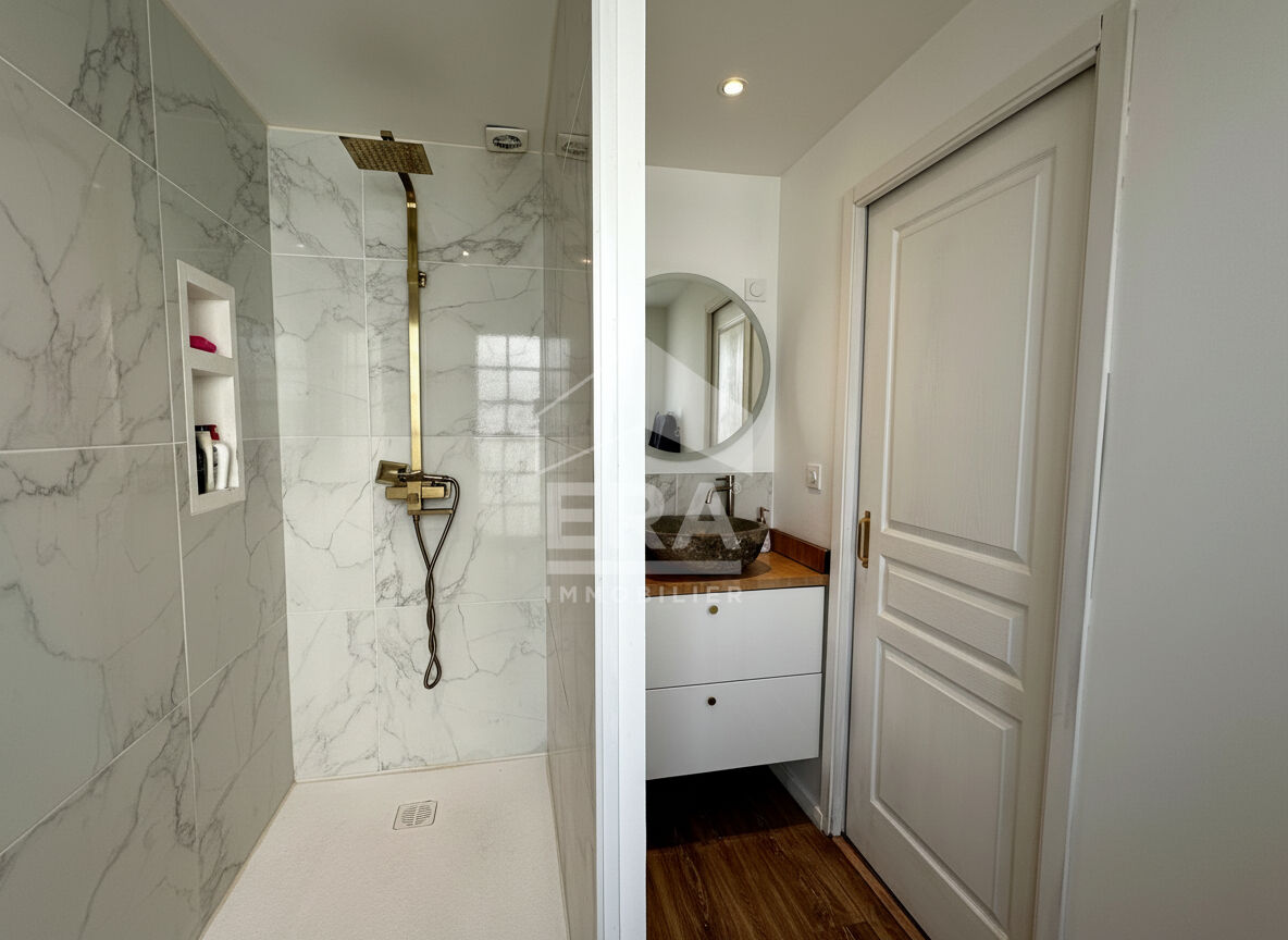 Rez-de-chaussée Entrée : 6,6 m² Cuisine/Salle à manger : 35,4 m², triple exposition avec 2 portes-fenêtres donnant sur la terrasse Salon : 34,1 m², cheminée en pierre avec un petit coin bibliothèque Vestibule vitré : 12,74 m² Chambre : 25,7 m² Salle d'eau attenante : 11,5 m², douche à l'italienne, WC, équipée aux normes PMR