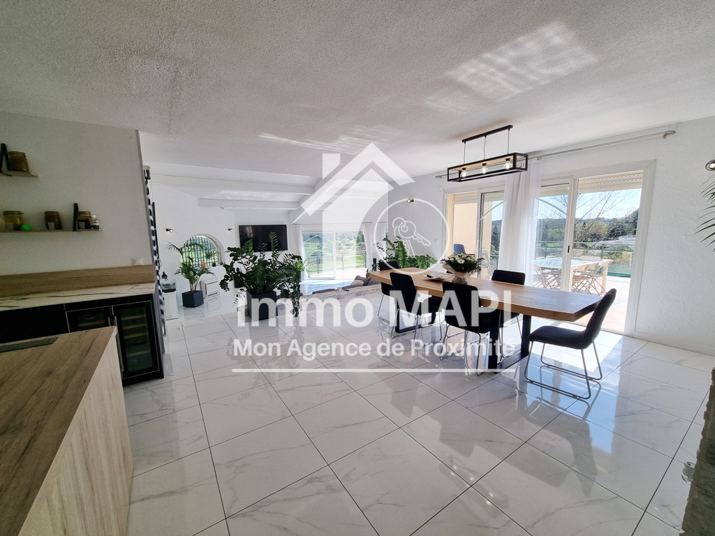 Propriété avec vues composée de deux habitations similaires. Propriété près du cur du charmant village de Roquebrun avec son large éventail de commodités telles que les restaurants, un bar, une supérette, un bureau de poste, ses caves viticoles ou encore une plage aménagée sur les rives de l'Orb et de diverses activités de loisirs. De par sa situation géographique, Roquebrun bénéficie d'un microclimat où orangers poussent en pleine terre. Roquebrun est également réputé pour son mimosa, son jardin méditerranéen et son architecture exceptionnelle. Les villes historiques de Béziers et de Montpellier (gares de TGV et aéroports internationaux) se trouvent respectivement à une petite demi-heure - et une heure de route en voiture. Située à 2 pas de la rivière et édifiée en 1998, cette grande villa dispose d'une configuration identique à chaque niveau : cuisine salon salle à manger 3 chambres 1 salle de bain et des toilettes séparées. De plus, à l'étage, 1 escalier en colimaçon conduit à une 7ième chambre. Ouvertures par baies vitrées soleil levant donnant à chaque niveau sur 1 grande terrasse totalement couverte. Une construction annexe constitue le garage pour 1 véhicule et la lingerie avec 1 salle d'eau supplémentaire + wc. A proximité de la piscine (10 x 5) le local technique (piscine au chlore ou au sel). Le terrain de 2165m² (constructible) se prolonge sur un jardin parfaitement entretenu avec essences méditerranéennes et un ravissant petit kiosque agrémente les lieux à proximité du terrain de pétanque (incontournable ici). Un forage alimente le jardin et la piscine. Climatisation réversible dans l'ensemble de l'habitation et climatisation gainable à l'étage. La villa bénéficie d'une superbe vue sur Roquebrun et est située proche des commerces du village. La villa est vendue meublée. Visites sur rendez-vous