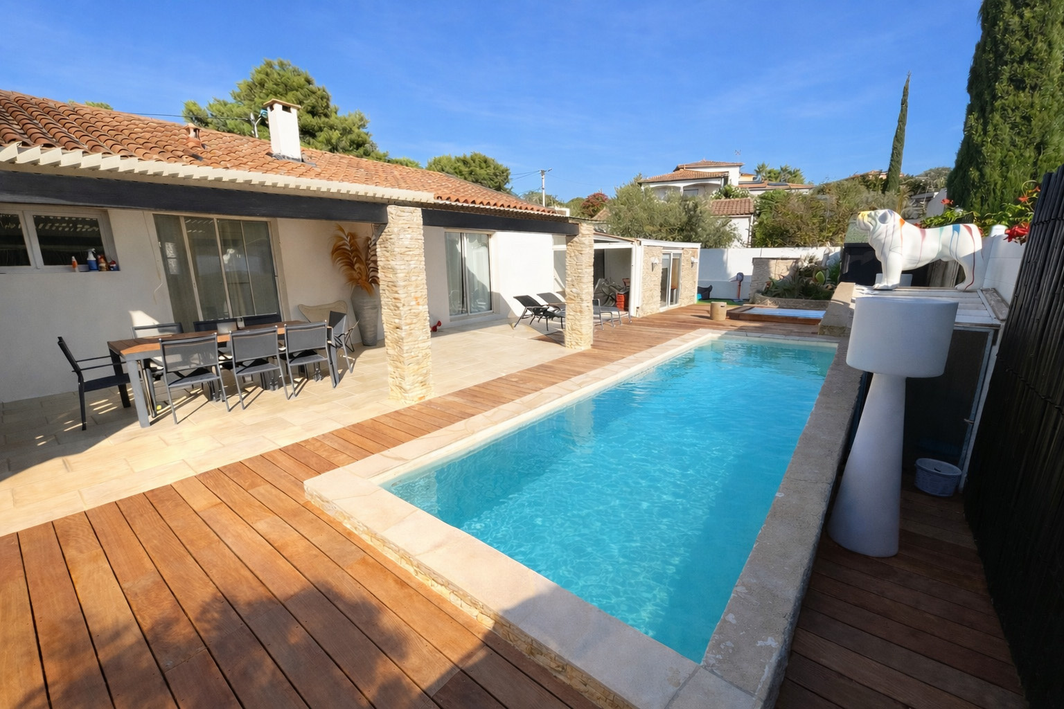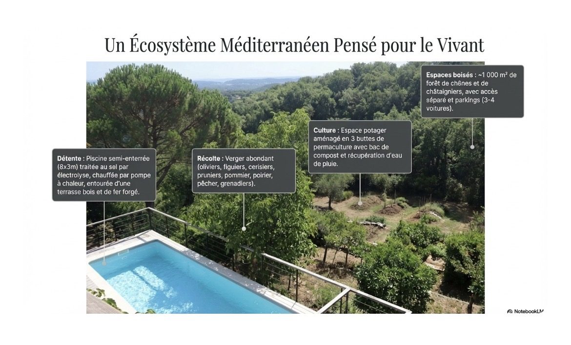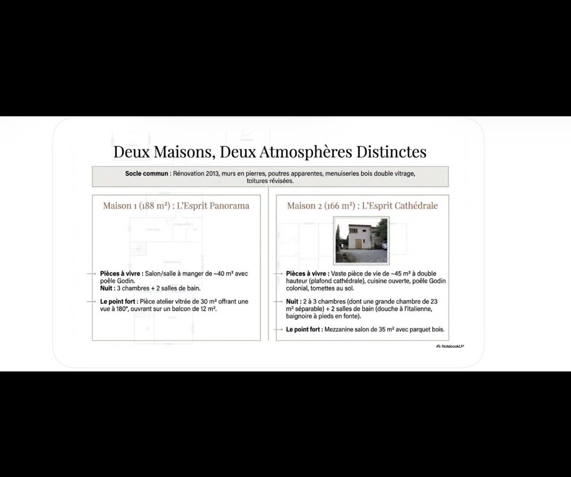 Propriété avec vues composée de deux habitations similaires. Propriété près du cur du charmant village de Roquebrun avec son large éventail de commodités telles que les restaurants, un bar, une supérette, un bureau de poste, ses caves viticoles ou encore une plage aménagée sur les rives de l'Orb et de diverses activités de loisirs. De par sa situation géographique, Roquebrun bénéficie d'un microclimat où orangers poussent en pleine terre. Roquebrun est également réputé pour son mimosa, son jardin méditerranéen et son architecture exceptionnelle. Les villes historiques de Béziers et de Montpellier (gares de TGV et aéroports internationaux) se trouvent respectivement à une petite demi-heure - et une heure de route en voiture. Située à 2 pas de la rivière et édifiée en 1998, cette grande villa dispose d'une configuration identique à chaque niveau : cuisine salon salle à manger 3 chambres 1 salle de bain et des toilettes séparées. De plus, à l'étage, 1 escalier en colimaçon conduit à une 7ième chambre. Ouvertures par baies vitrées soleil levant donnant à chaque niveau sur 1 grande terrasse totalement couverte. Une construction annexe constitue le garage pour 1 véhicule et la lingerie avec 1 salle d'eau supplémentaire + wc. A proximité de la piscine (10 x 5) le local technique (piscine au chlore ou au sel). Le terrain de 2165m² (constructible) se prolonge sur un jardin parfaitement entretenu avec essences méditerranéennes et un ravissant petit kiosque agrémente les lieux à proximité du terrain de pétanque (incontournable ici). Un forage alimente le jardin et la piscine. Climatisation réversible dans l'ensemble de l'habitation et climatisation gainable à l'étage. La villa bénéficie d'une superbe vue sur Roquebrun et est située proche des commerces du village. La villa est vendue meublée. Visites sur rendez-vous