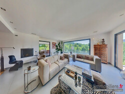 Cette magnifique maison, idéalement située en position dominante, offre une tranquillité absolue, sans vis-à-vis ni nuisances. Elle se compose comme suit : Au rez-de-chaussée : Une entrée accueillante. Un WC avec lave-mains. Une cuisine équipée très lumineuse, ouverte sur un vaste salon/séjour d'environ 100 m². Cet espace de vie baigné de lumière dispose de larges surfaces vitrées offrant une vue exceptionnelle et donnant accès à trois terrasses. Une suite parentale d'environ 48 m² avec dressing, accès à une terrasse privative et une salle de bain de 11 m² équipée d'une douche à l'italienne et d'une baignoire balnéo. À l'étage : Une chambre d'environ 36 m². Un espace séparé par une double porte à galandage comprenant une salle de bain (douche à l'italienne et baignoire), un WC et un dressing. Au rez-de-jardin : Une suite d'environ 58 m² avec terrasse privative, salle d'eau (douche à l'italienne), WC séparé et dressing. Extérieurs : Un espace piscine avec bain de soleil et palmiers devant la terrasse. La piscine de 10 x 3,50 m est chauffée et dispose d'un traitement au sel. Un pool house avec douche extérieure en bout d'espace. Sous-sol : Un garage double d'environ 67 m² avec deux portes motorisées. Une buanderie. Une cave à vin climatisée. Équipements et Aménagements : La maison est équipée de panneaux solaires photovoltaïques et d'un ballon thermodynamique. Le chauffage est électrique au sol dans l'espace de vie et par radiateurs dans les chambres. L'accès à la maison est en macadam, le portail est électrique, et le terrain est aménagé et arboré sur 2 200 m², plus 5 918 m² en parc entretenu par un agriculteur.
