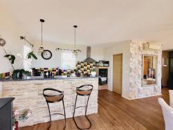 Un séjour avec poêle à bois ouvert sur un espace salle à manger/cuisine (toute équipée) avec deux baies vitrées donnant accès à une grande terrasse à demi couverte d'environ 60m2, une suite parentale avec accès terrasse comprenant une salle d'eau et une accès à la terrasse, un cellier et un WC indépendant.