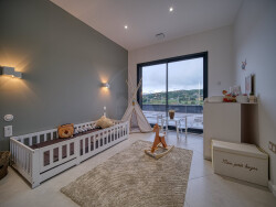 Le rez-de-chaussée s'articule autour d'une pièce de vie lumineuse de 60m² environ, prolongée par une cuisine ouverte de 23m² environ et un cellier de 10m² environ. Deux terrasses viennent valoriser la vue panoramique offerte par la maison.