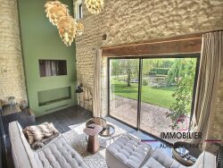 L'allée d'accès, bordée par un étang et son saule pleureur, instaure dès l'arrivée un cadre bucolique et intimiste. La maison, entièrement rénovée avec des prestations de qualité, offre une pièce à vivre d'environ 77 m² organisée en différents volumes : une cuisine équipée, fonctionnelle et conviviale avec cheminée, un séjour et un espace salon. L'ensemble du rez-de-chaussée s'ouvre sur une terrasse paysagée de 90 m² parfaitement aménagée, complétée par une piscine chauffée de 6 x 3 m.