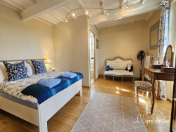 A l'étage : Hall spacieux avec escalier en bois et rampe traditionnelle menant aux chambres. Le plancher est en bois massif sur tout l'étage. 2 chambres dites parentales coté sud, et une superbe vue dégagée. À l'arrière, trois chambres supplémentaires, une salle de bain avec baignoire et une douche séparée, des WC. La chambre principale dispose d'une baignoire intégrée dans la chambre et salle d'eau plus loin et la climatisation réversible.