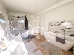 Le rez-de-chaussée abrite également une chambre parentale avec une belle salle de bain, équipée de lavabos double vasque, d'une douche à l'italienne et d'une baignoire. Un dressing aménagé de 8 m² complète cet espace. À ce niveau, une entrée de service spacieuse permet d'accéder à la buanderie.