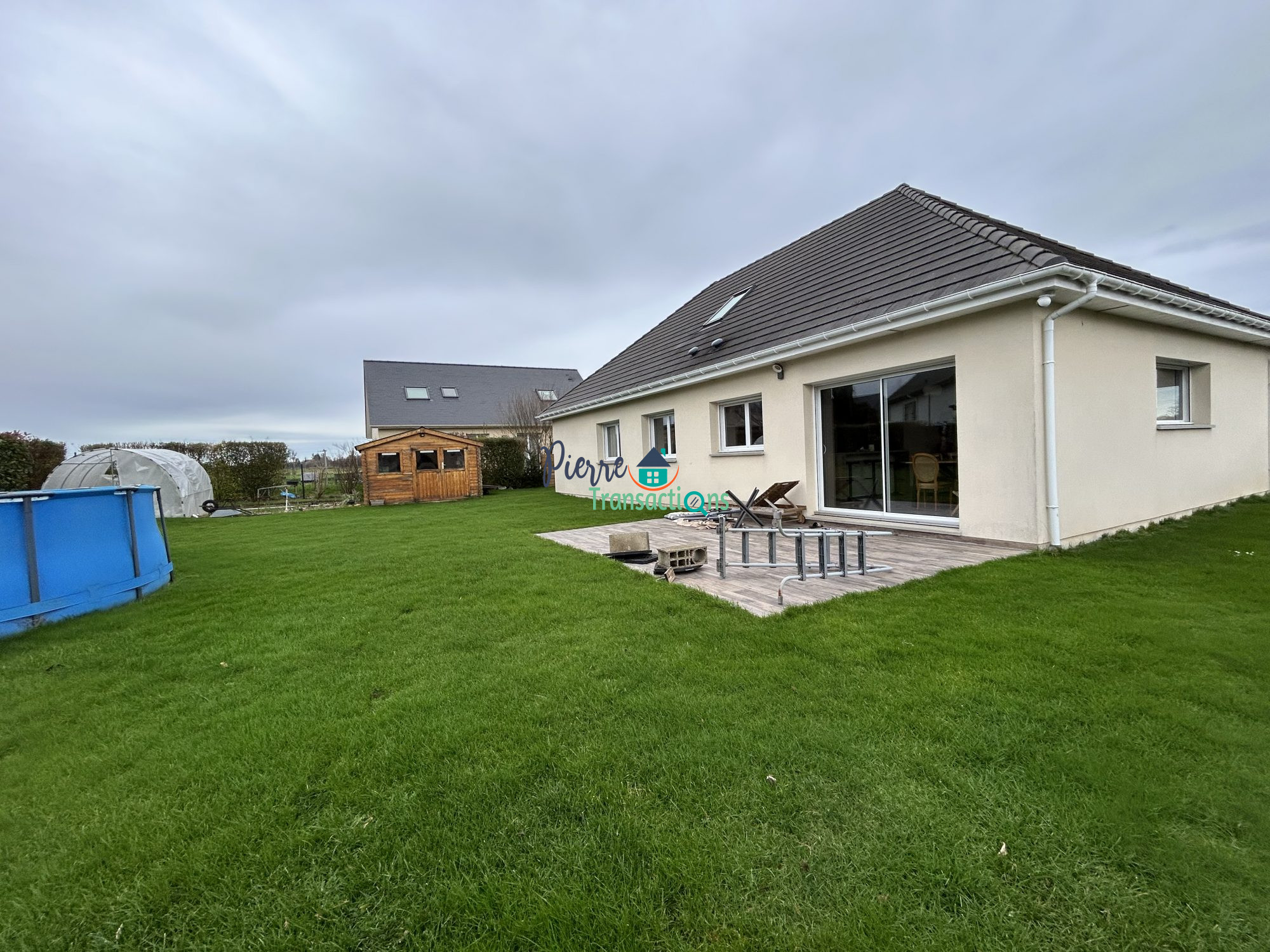 Jardin de 3450 m² environ avec terrasse, piscine semi-entérrée, dépendnace de 42 m² au sol, appenti et stationnements !