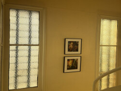 L'escalier en béton, éclairé par des vitrages texturés à l'intérieur, doublés de carreaux de verre à l'extérieur, conduit à l'étage supérieur, où trois chambres sur parquet d'époque et une salle de bains dessinent un espace nuit fonctionnel et lumineux.