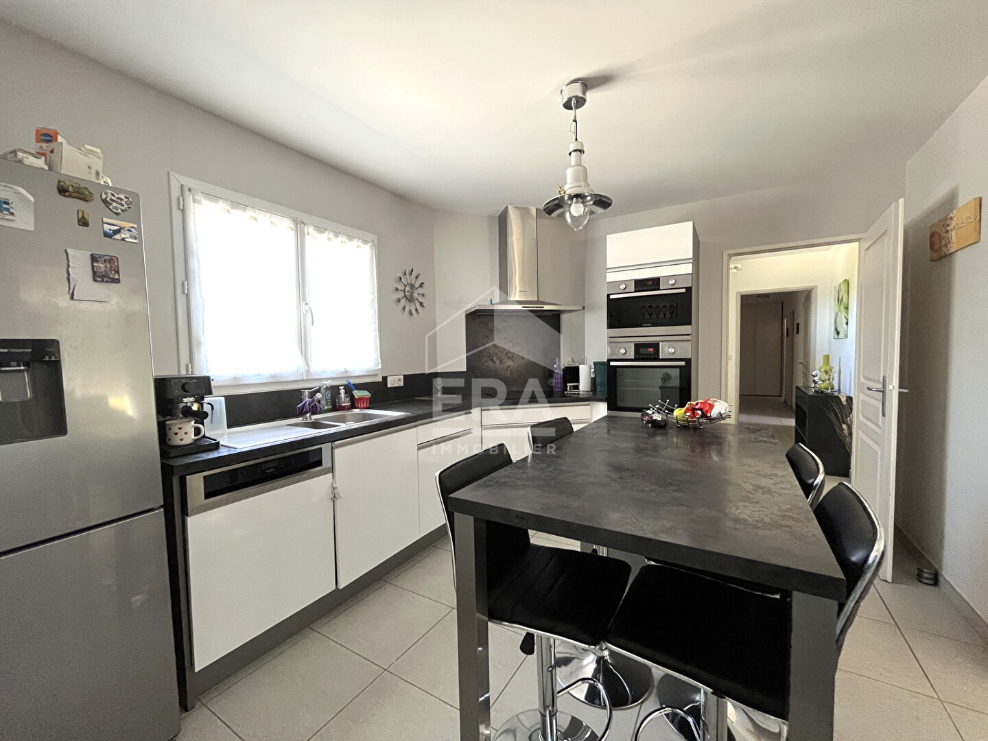 Cette maison d'une superficie de 105 m2 habitables, a été construite en 2005 avec des matériaux de qualités, elle propose au rez-de-chaussée un hall d'entrée avec WC, une cuisine équipée de 9 m², une buanderie, un salon chaleureux avec son poêle à bois de 20 m², ainsi qu'une salle à manger lumineuse de 22 m², donnant sur une agréable terrasse couverte proche de la piscine.