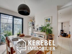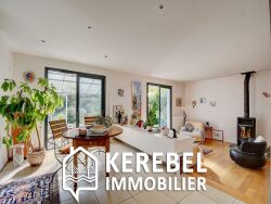 KEREBEL IMMOBILIER LOPERHET : Située dans un quartier résidentiel, dans un écrin de verdure, à seulement 1 km du centre et à proximité immédiate des cars scolaire, venez découvrir cette maison d'environ 180 m² habitables rénovée avec goût.