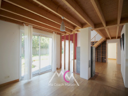 Au rez-de-chaussée, une entrée séparée dessert une pièce de vie lumineuse avec une cuisine aménagée et équipée ouverte sur un salon-séjour chaleureux avec son poêle à bois en pierre stéatite (Tulikivi) et son espace bibliothèque. Pour vivre confortablement de plain-pied, deux chambres dont une disposant un bel espace pouvant être aménagé en dressing, une spacieuse salle de bains et un wc. Attenant à la cuisine, un cellier/espace buanderie, permet d'avoir un espace de rangement supplémentaire. En visitant l'étage, vous serez séduit par la mezzanine qui surplombe le salon et offre une vue sur le jardin. Deux chambres, une salle d'eau avec wc et un espace de rangement, complètent ce niveau. De beaux volumes, des matériaux de qualité, une belle luminosité !