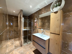 Une salle d'eau moderne avec douche à l'italienne, meuble vasque et WC