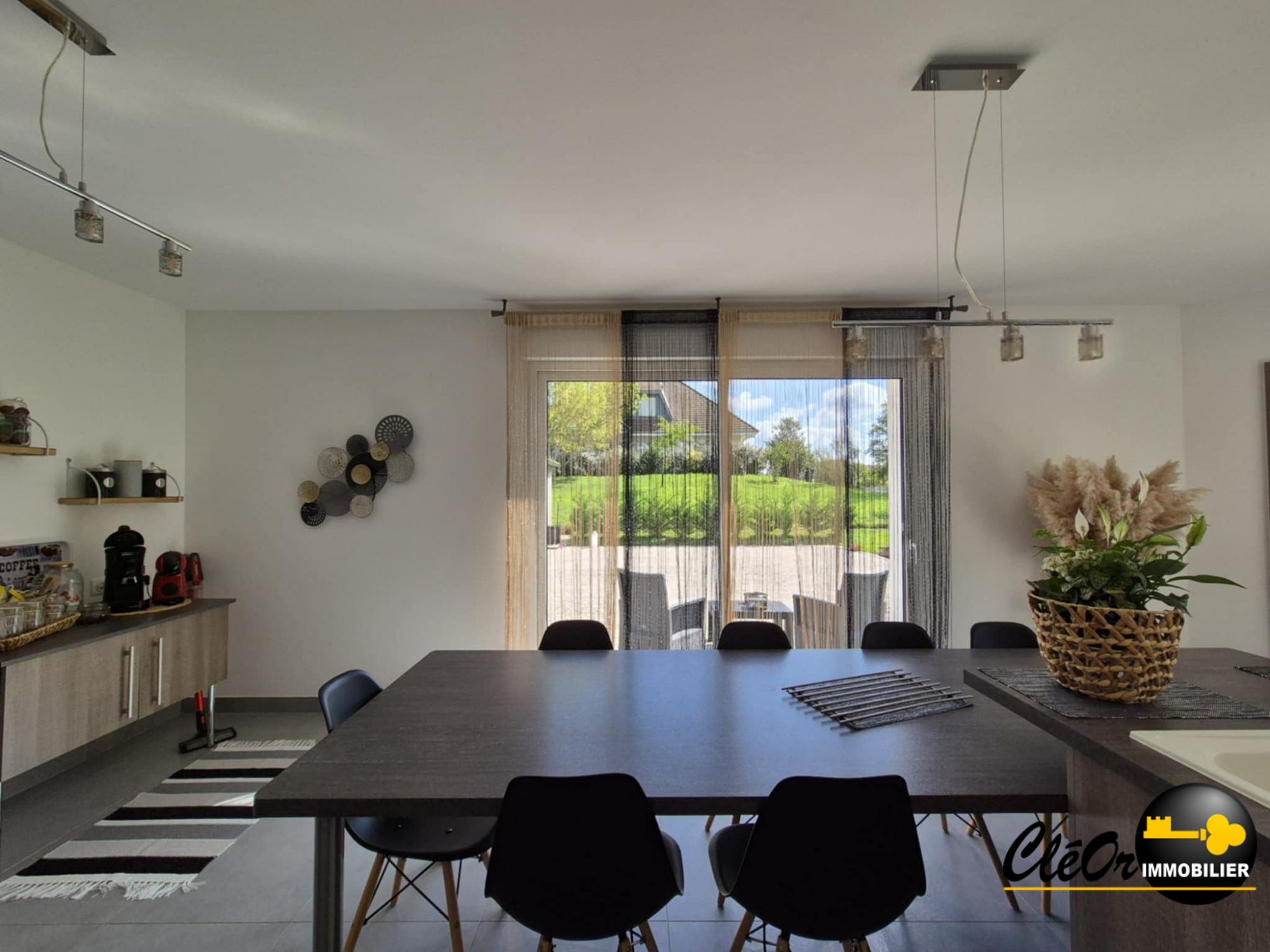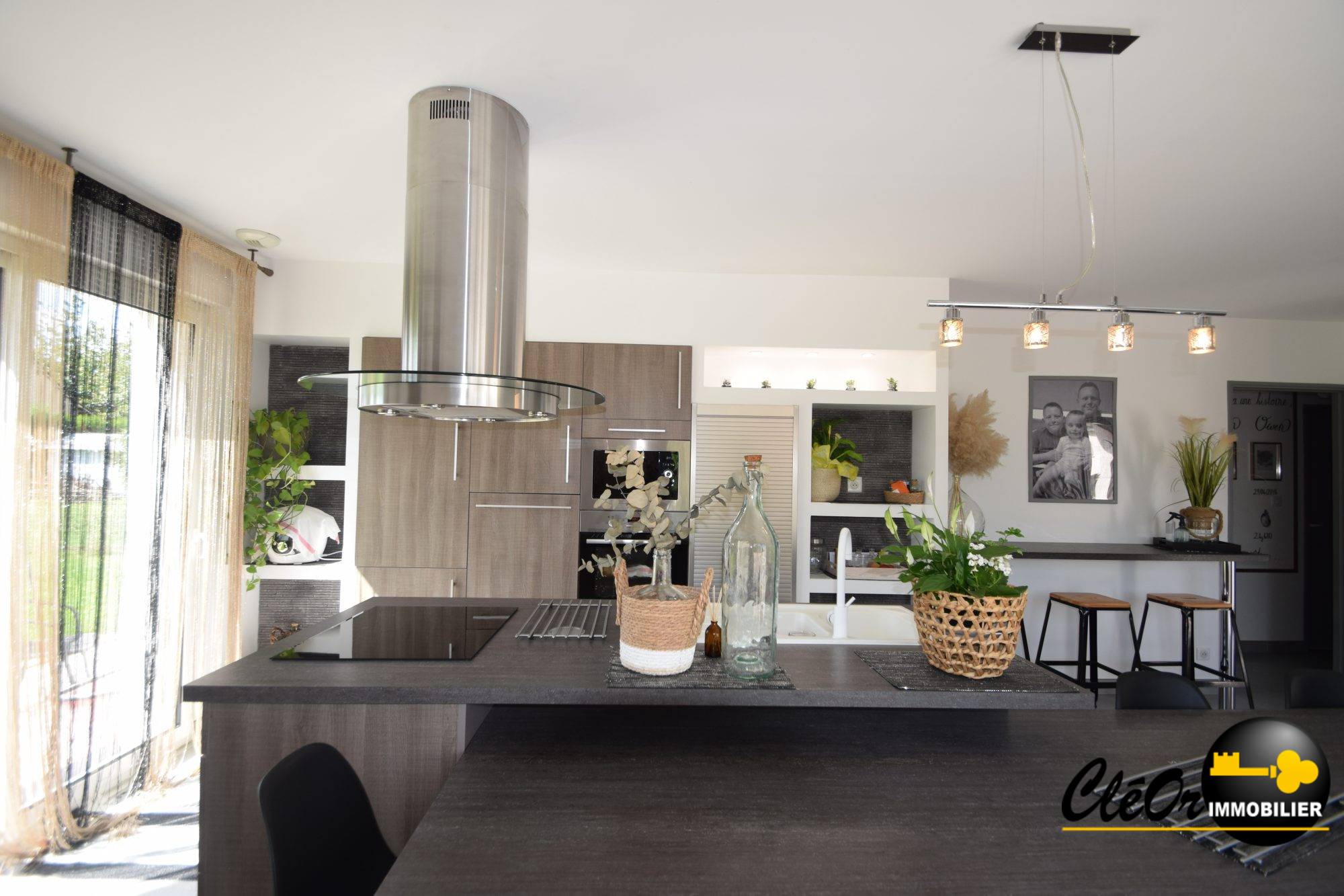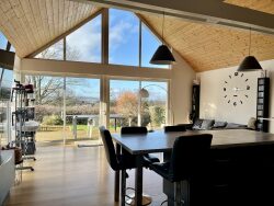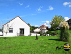A VENDRE, 5MN TOURNUS, RARE, maison ossature bois de style 'canadien' de plain-pied de 2017, 4 pièces, 92 m² habitables sur terrain avec terrasse et piscine de 792 m². L'habitation comprend : entrée avec placard, belle pièce de vie avec cuisine équipée ouverte donnant sur les extérieurs exposés Ouest avec plafond cathédrale et baies vitrées sur toute la hauteur, deux chambres dont une ouvrant sur une terrasse, salle d'eau/douche italienne, toilettes séparées, cellier et chaufferie. Le garage de 40 m², avec portes automatisée, est relié à l'habitation par une coursive. La maison est équipée d'une pompe à chaleur air/eau, avec dalle chauffante et climatisation réversible en complément. L'isolation est complète et les huisseries sont en double vitrage PVC et alu pour les baies vitrées, volets roulants électriques sur l'ensemble. Elle possède de nombreux équipements : adoucisseur, récupérateur d'eau de pluie alimentant les toilettes, fibre Internet, l'assainissement est relié au tout à l'égout. Belle piscine chauffée (pompe à chaleur) et sécurisée, les extérieurs sont paysagés, clos et arborés, deux belles terrasses en bois permettent d'apprécier la vue panoramique et dominante sur la campagne environnante. Le tout, très bien entretenu dans un bel environnement, cette villa se situe tout proche des commodités de Tournus.