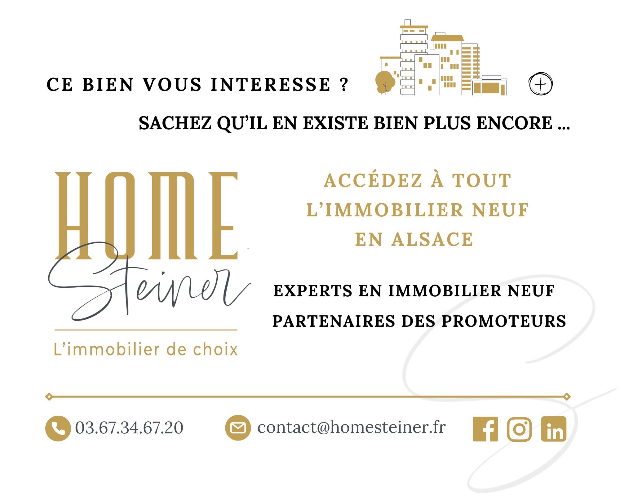 Chez Home Steiner, nous travaillons avec les promoteurs immobiliers en Alsace pour trouver le bien idéal selon votre projet. Alors n'attendez plus, dégainez votre téléphone et contactez Marine au 06.79.69.38.38