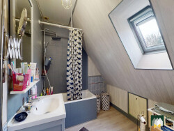 A l'étage, le palier dessert : - Deux belles chambres dont une avec dressing - Une petite chambre / bureau - Une salle de bains avec wc - Un espace de rangement
