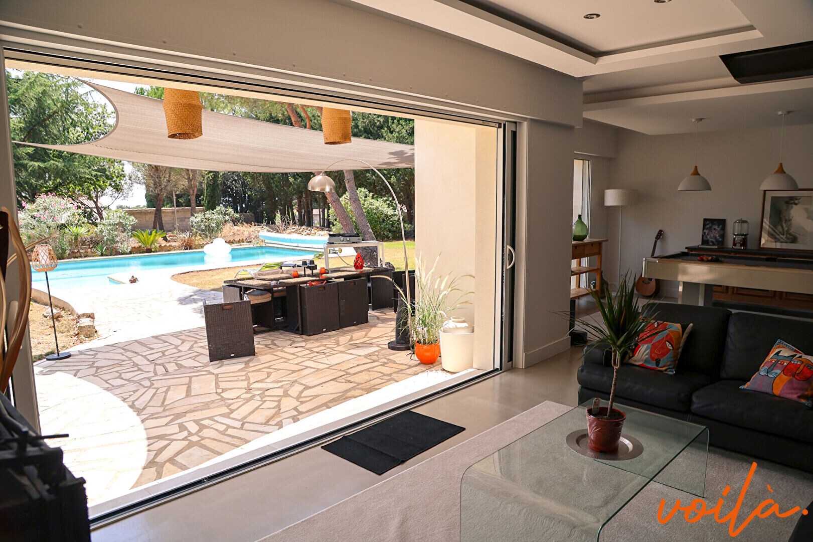 Réf :" PALMSPRINGS" Votre agence immobilière Voilà vous propose une villa à l'architecture contemporaine. Située aux portes de Carcassonne, à quelques pas du Lac de la Cavayère et des sentiers de randonnées , elle développe une surface de 205 m2 au total, le tout au coeur d'un terrain de 1015m2. Grâce à sa conception bien pensée, toutes les pièces de vie sont tournées vers l'extérieur. Cette maison neuve offre de beaux volumes composés d'un majestueux hall d'entrée totalement vitré, d'un séjour, d'une cuisine équipée ouverte , d'une salle-à-manger , sans oublier le patio intérieur qui entièrement vitré et permettant d'accéder à la grande terrasse ; rend un effet dedans / dehors exceptionnel. Le coin nuit est composé de 3 chambres dont une suite comprenant salle d'eau + baignoire et dressing aménagé ; les deux autres suites disposent chacune d'un salle d'eau et de placards de rangement. Deux toilettes et buanderie complètent le tout. Vous pourrez également profiter de deux grands garages de 40 m2 chacun avec portes motorisées, deux abris voitures en dur et une cave à vin secrète. Dans le jardin clos, une piscine de 8 x 4 au sel avec alarme confère à l'ensemble un air de vacances. Les plus : climatisation gainable individuelle, volets roulants électriques centralisés, double vitrage en aluminium, alarme individuelle, ballon thermodynamique, mitigeur de cuisine connecté pour de l'eau filtré plate ou pétillante, fibre, portail d'entrée motorisé. Possibilité de vente meublé. Village toutes commodités (supermarché, docteur, pharmacie, école..). VUE EXCEPTIONNELLE A COUPER LE SOUFFLE surplombant le village, cette villa offre un cadre de vie agréable dans un quartier recherché. Produit UNIQUE! Les informations sur les risques auxquels ce bien est exposé sont disponibles sur le site Géorisques : www.georisques.gouv.fr Le prix indiqué comprend les honoraires de négociation, ces honoraires sont à la charge exclusive du vendeur. Camille Maurette, Directrice, immatriculée au RSAC de Carcassonne sous le numéro 90464305300021 - carte professionnelle n° CPI11012021000000008.