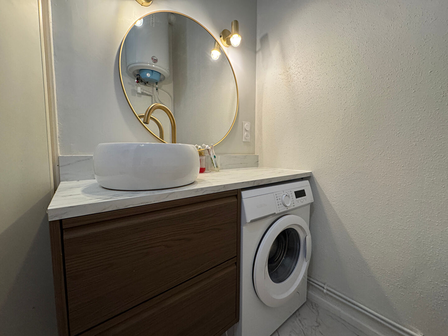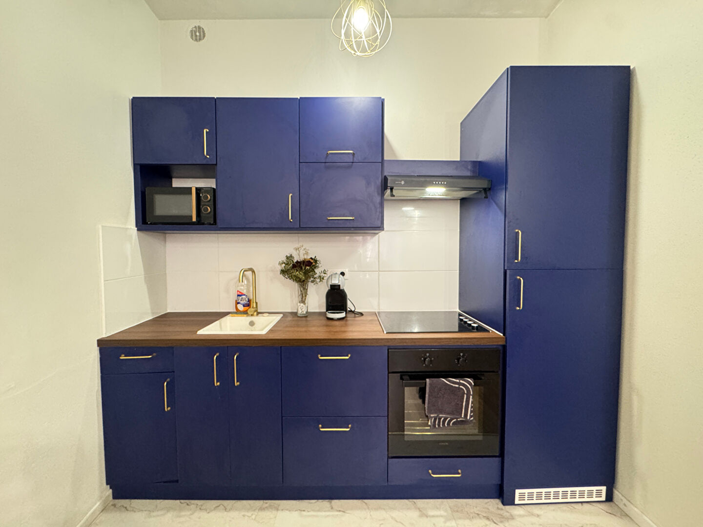 L'entrée s'ouvre sur une pièce de vie, cet espace est complété par une cuisine aménagée et semi-équipée d'une plaque électrique et d'une hotte. Dans le coin nuit, une chambre, une salle d'eau avec un meuble vasque et un WC.