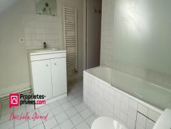 Salle de bains avec meuble vasque, baignoire avec douchette et pare douche, radiateur, sèche serviette et vélux avec volet roulant motorisé.
