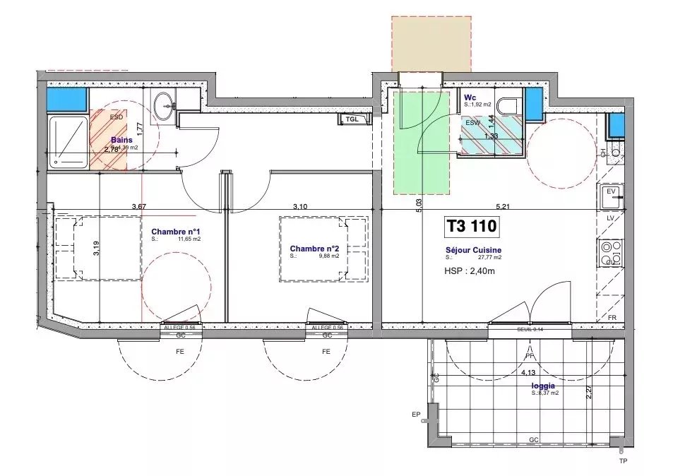 L'appartement comprend une belle pièce de vie de 26,23 m² avec cuisine ouverte donnant sur une loggia de 5,61 m² exposée Est, une chambre de 11,41 m² et une salle de bains avec toilettes de 5,99 m².