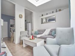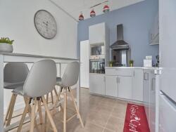 Une cuisine entièrement équipée ( frigo, micro onde, four, ustensiles de cuisines....) espace buanderie avec machine à laver et sèche linge ), donnant sur une belle cour , avec salon de jardin. WC au rez de chaussé.