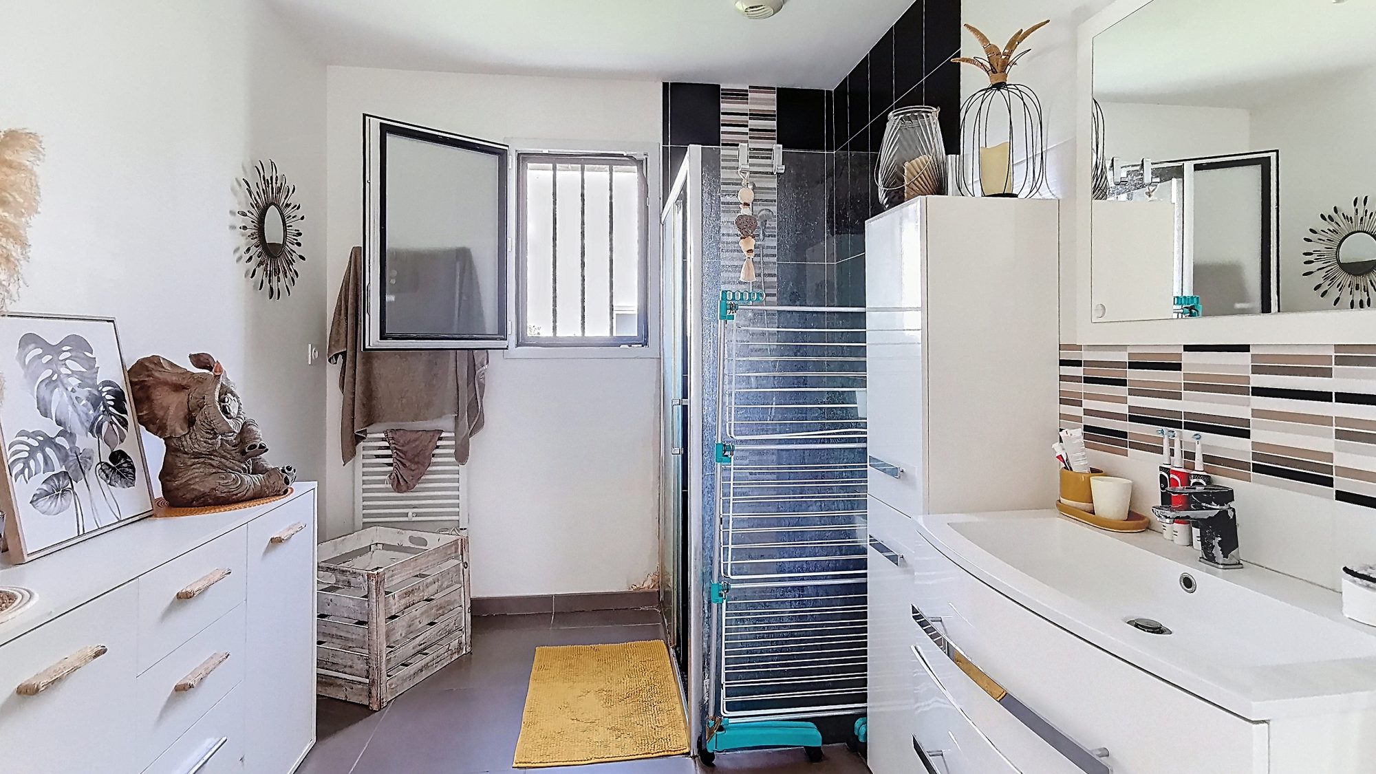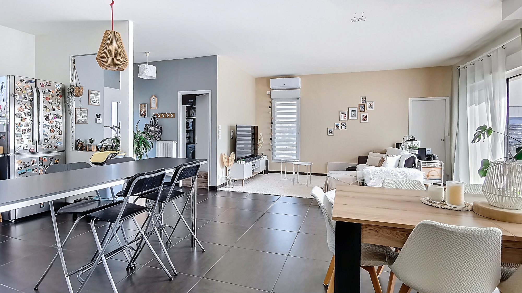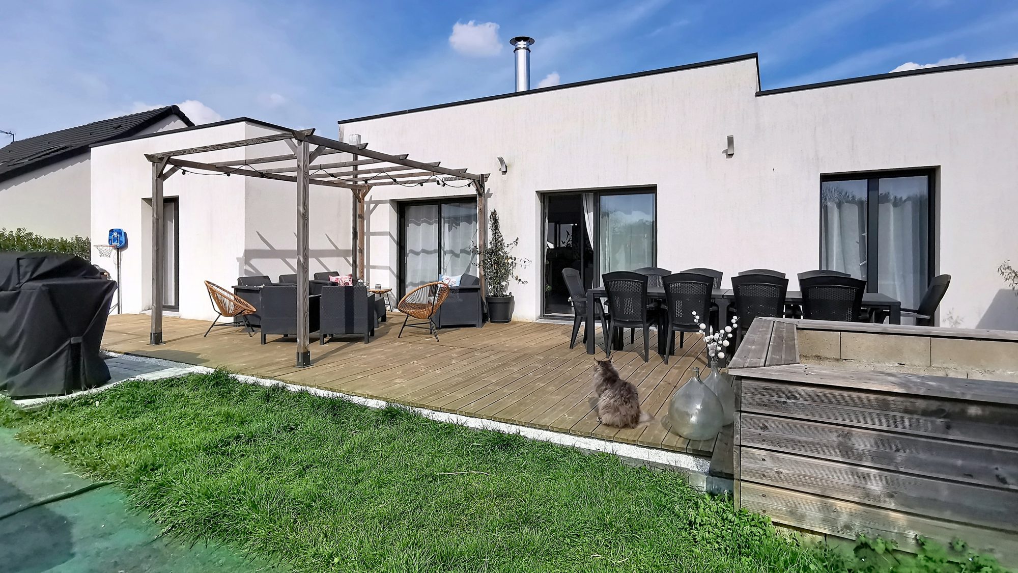 Vivable de plain-pied, cette maison de 110 m² répond parfaitement aux attentes des personnes en quête de praticité et d'accessibilité, tout comme aux familles souhaitant une maison fonctionnelle et évolutive. - Au rez-de-chaussée vous découvrirez une entrée, un séjour spacieux et lumineux avec cheminée, une cuisine aménagée avec accès direct à la terrasse, un cellier, deux chambres avec accès au jardin ainsi qu'une salle d'eau et un WC indépendant. - À l'étage, vous disposerez de deux chambres supplémentaires ainsi que d'une seconde salle d'eau avec WC.