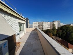 Saint-Jacques/Glacière. Dans Copropriété moderne, bien tenue, sécurisée (Gardien). Proche des Transports (RERB, M4/6, B62 Orlybus) au calme et très clair, avec asc. Appartement atypique et rare, au dernier étage avec vue imprenable et panoramique, comprenant Entrée, Double Séjour, 3 Ch. Cuisine équipée séparée, Salle de Douche, 2 WC indé. Placards Range. intégrés, Dégagements, Véranda de 23m², Terrasse en U de 51m². 2 Caves, 1 Emplacement PK. A rénover. Charges= 610€/mois. ECh et Chauf. coll. Hono. Ag.= 3,7% à charge Acquéreur. Copro. de 278 lots. Libre.